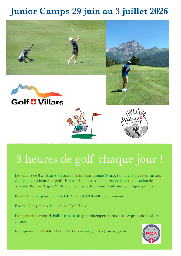 JUNIORS GOLF C. VILLARS, 1884 VILLARS-SUR-OLLON, Banque Cantonale Vaudoise IBAN: CH9700767000S56379862, BIC/SWIFT: BCVLCH2LXXX